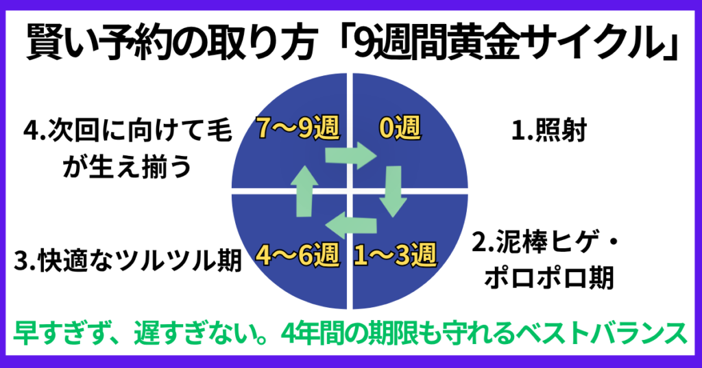 - 9週間空けると、ちょうど泥棒ヒゲが終わり、「ツルツル期間」をしっかり味わってから次へ行けるのでモチベーションが維持しやすい